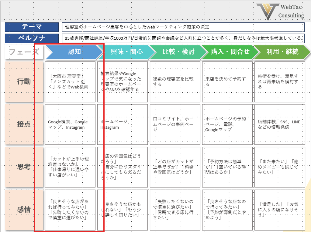 次に、顧客がサービスを知るまでにどのような行動を取るのかを整理します。行動プロセスは「行動」「接点」「思考」「感情」といった視点で整理すると、顧客の状況をより具体的に理解することができます。