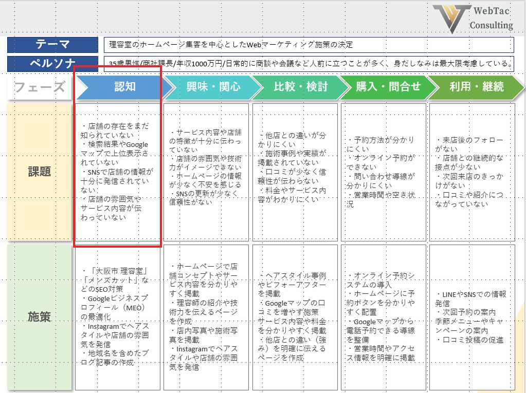 行動プロセスを整理したら、次に各フェーズで顧客がどのような課題や障壁を感じているのかを考えます。顧客が行動できない理由を理解することで、Web集客の改善ポイントを見つけることができます。