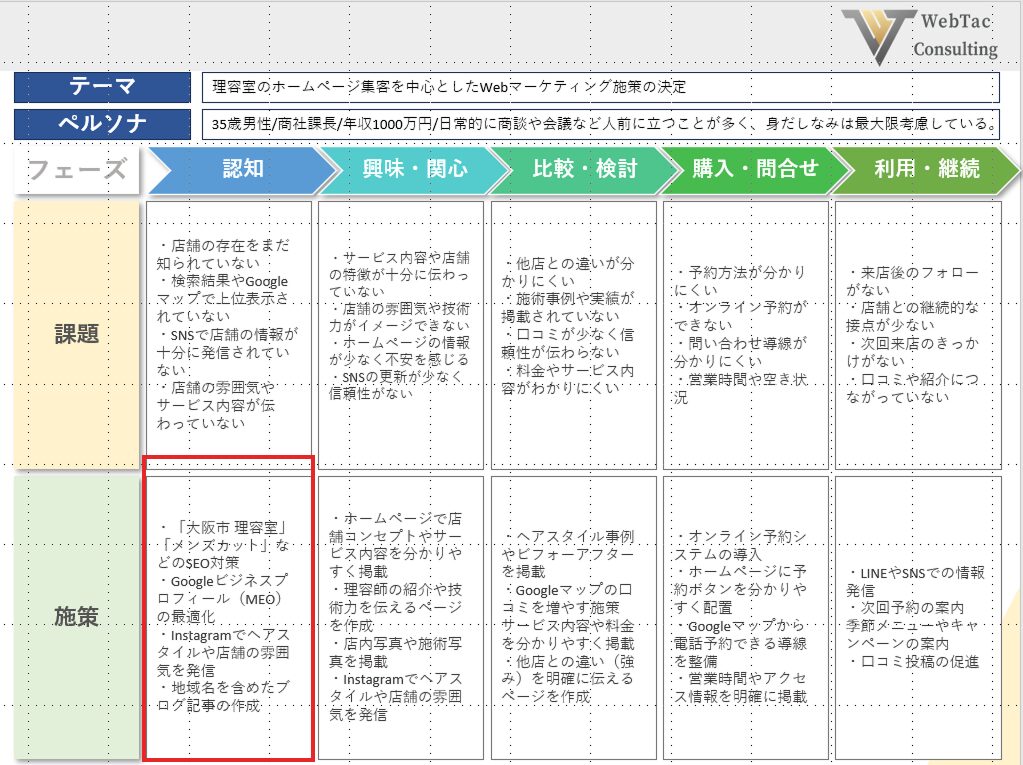 このようにフェーズごとに施策を設計することで、顧客の行動フェーズに合わせた効果的なWeb集客戦略を構築することができます。