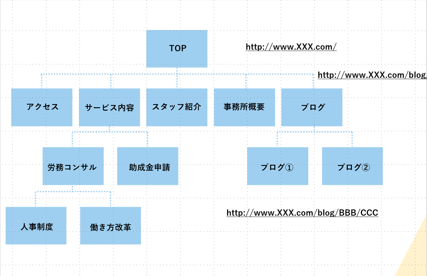 どのページを作るのかを整理し、ページ同士の関係を階層構造でまとめます。